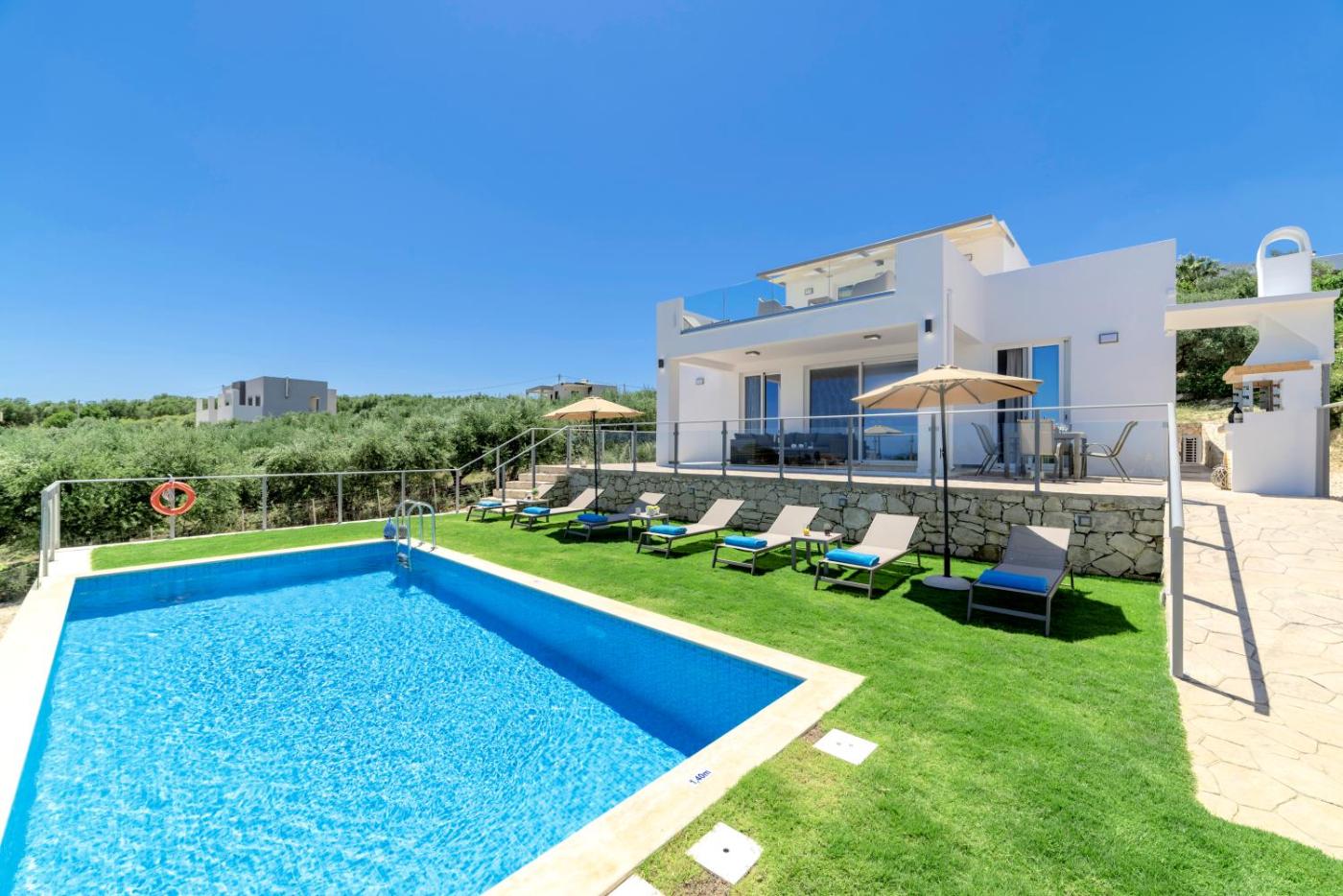 Villa. This villa provides a pool with a view. Featuring a private entrance, this air-conditioned villa is comprised of 1 living room, 5 separate bedrooms and 4 bathrooms with a walk-in shower and a bath. Guests will find a stovetop, a refrigerator, a dishwasher and kitchenware in the well-equipped kitchen. The villa also has a barbecue. Boasting a terrace with sea views, this villa also offers a washing machine and a flat-screen TV with satellite channels. The unit offers 9 beds.